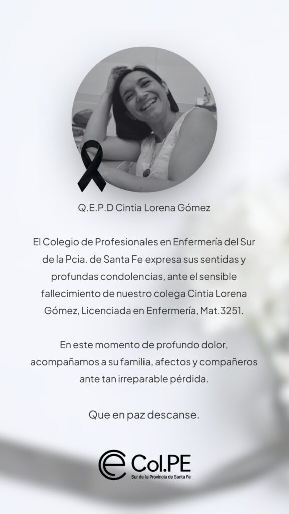 Q.E.P.D Cintia Lorena Gómez El Colegio de Profesionales en Enfermería del Sur de la Pcia. de Santa Fe expresa sus sentidas y profundas condolencias, ante el sensible fallecimiento de nuestra colega Cintia Lorena Gómez, Lic. en Enfermería, Mat. 3251. En este momento de profundo dolor, acompañamos a su familia, afectos y compañeros ante tan irreparable […]