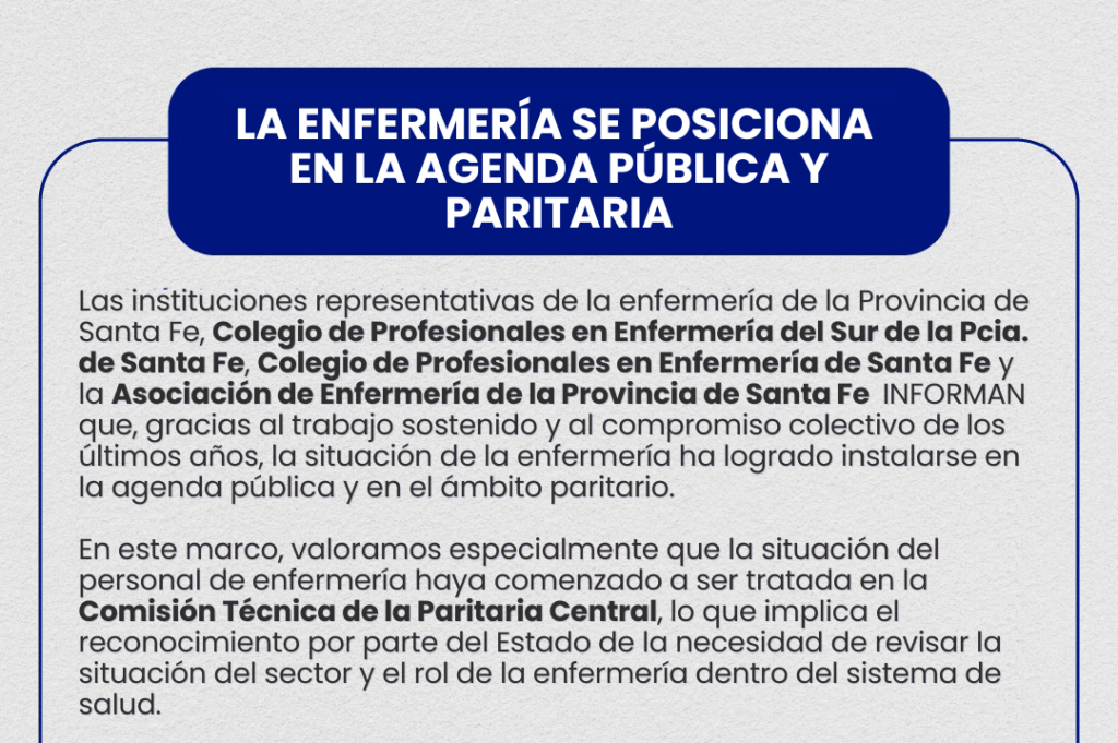 COMUNICADO IMPORTANTE Las instituciones representativas de la enfermería de la Provincia de Santa Fe, Colegio de Profesionales en Enfermería del Sur de la Pcia. de Santa Fe, Colegio de Profesionales en Enfermería de Santa Fe y la Asociación de Enfermería de la Provincia de Santa Fe INFORMAN que, gracias al trabajo sostenido y al compromiso […]